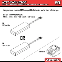 Scale 1/10 Battery Sold Separately Power Type Electric Completion Level Ready-To-Run Technology DSC Wheelbase 12.87" (327 mm) Product Height 8.27" (210 mm) Motor Type Brushless Body Painted, Decaled, Trimmed Vehicle Size Standard Product Width 12.01" (305 mm) Product Length 21.97" (558 mm) Charger Sold Separately Power System 3S Receiver Included Servos Included LiPo Compatibility 2S, 3S Product Weight 7.83 lb (3.55kg) Speed Control Included Chassis Composite Connector Type IC5 Vehicle Type Short Course Truck Shock Type Oil-filled, coilover Top Speed 50+ Drivetrain 4WD Radio Included