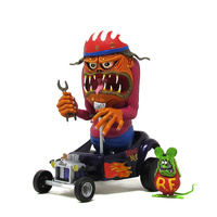 Drag Nut Monster can stand alone or be positioned in his Hot Rod. Model comes molded in white with metal axles and rolling wheels and includes a small companion Rat Fink Figure to complete the scene.