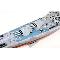 1/500 Scale. This kit features 144 parts and measures 17 3/4 inches long. Molded in gray with display stand and decals for both Washington and Carolina battleships. Model was built and painted by Guy Malone. The US Battleship North Carolina (BB-55), lead ship of a class of 35,000-ton battleships, was built at the Brooklyn Navy Yard. The USS North Carolina was quickly nicknamed "The Showboat" because of all the attention she drew during her trials in New York Harbor. At the time of her commissioning on April 9th 1941, she was considered the world’s greatest sea weapon. Armed with nine 16-inch/45 caliber guns in three turrets, and twenty 5-inch/38 caliber guns in ten twin mounts, North Carolina proved a formidable weapons platform. Her wartime complement consisted of 144 commissioned officers and 2,195 enlisted men, including 86 Marines. In her modern version, the catapult-launched float planes have been replaced by Helicopters for observation service.The North Carolina went to the Pacific in June 1942. She took part in the Guadalcanal campaign during the rest of that year, covering the initial landings there and participating in the Battle of the Eastern Solomons in August 1942. She was damaged by a Japanese submarine torpedo on September 15th that year, in an attack that also fatally damaged USS Wasp (CV-7), but returned to the Solomons combat zone after a few months' repairs. During an enemy air attack in the Battle of the Eastern Solomons, the North Carolina threw up such a fierce barrage from her anti-aircraft batteries that the mighty Carrier Enterprise signaled to her "ARE YOU AFIRE?!" due to all the smoke.In November 1943, North Carolina assisted in capturing enemy positions in the Gilbert Islands. This began a pattern of operations for her that lasted for the rest of World War II: serving in the anti-aircraft screen of aircraft carrier task forces and occasionally using her heavy guns to bombard Japanese-held islands. In these roles, during 1944 she was involved in the Marshalls operation in January-February, attacks on Central Pacific targets through the late winter and spring, the Marianas invasion and Battle of Philippine Sea in June, and Western Pacific carrier strikes in November and December.North Carolina continued her Western Pacific activities in 1945, participating in the invasions of Iwo Jima in February, and Okinawa in March and April. The battleship also screened carriers on raids throughout the combat zone, including attacks on the Japanese home islands. Although this mighty naval battlewagon had been torpedoed, dive-bombed, strafed, shelled, and suffered many near misses, she had never been put out of commission by enemy action even though Tokyo Rose had reported her as sunk no less than 6 times during the course of the Pacific war! By the time the mighty "Showboat" steamed into Tokyo Bay and dropped anchor on September 5th, 1945 after 40 months of action in the Pacific War, her score was admirable. She was credited with destroying 27 Japanese aircraft plus a large number of probables. During 9 major naval bombardments she destroyed literally billions of dollars worth of enemy shore installations, Naval units, and personnel. She was truly a major factor in the power that stopped the ascent of the "Rising Sun", and a stirring tribute to the many Americans who built, supplied, and manned her, and the few who were wounded and died serving her.In 1961 the North Carolina was transferred to the State of North Carolina to become a memorial and museum at Wilmington, where she remains to this day.