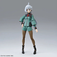 Her uniform is molded in color, and the markings on her shoulders and chest are recreated using stickers, simplifying the assembly process. Miorine Rembran's leg joints are thoughtfully designed to provide a wide range of motion while maintaining a natural silhouette, ensuring dynamic and lifelike poses. The kit includes barefoot parts and interchangeable hands, further enhancing the display possibilities.