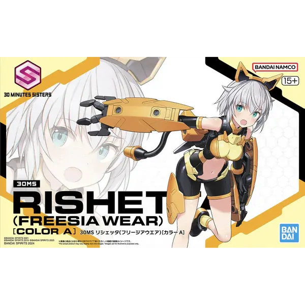 Rishetta returns to Bandai's "30MS (30 Minutes Sisters)" model-kit lineup with a completely new design! The parts on the runners are arranged in a way that's optimal to ease of assembly and efficient work flow, allowing for smooth assembly. You can customize her into her armed mode by assembling the armor parts! Three tampo-printed facial expressions are included: normal, smiling and confused; a large claw unit is suspended from her backpack, and it can be transformed and attached to an arm. The head comes with a cat-ears headband and a tail part made with lead wire for flexibility. The abdomen has a mechanism to prevent the hip joint parts from coming off, so the structure is designed to prevent them from separating when moving the legs during posing. Additional "30MS" optional parts such as faces, hairstyles and body parts are sold separately, so you can customize her to your heart's content! The soles of her shoes have 3mm joints suitable for customization, too. Order her for your own collection today!