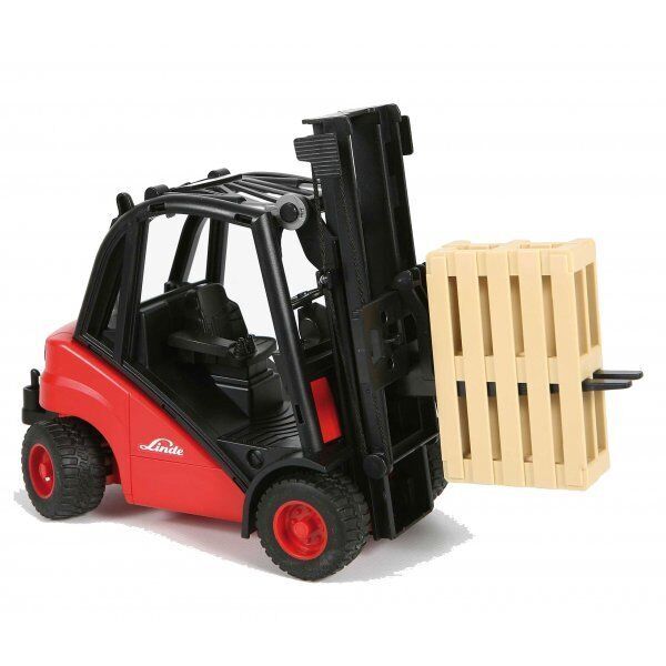 The Linde H30D forklift is an industrial stacker that is in fact operated with diesel or gas. The impressive original in Porsche design presents a very attractive template for the toy model. The stacker is equipped with a double-stage lift mast whose lift and tilt function can be operated with one hand. The hydraulic pitch cylinders mounted in the roof are used for setting the tilt of the lifting mast. The model has easy-to-operate steering that enables the children to manoeuvre a load in the tightest space just like the original. The fork prongs are, of course, adjustable and detachable. Two Euro pallets are included.