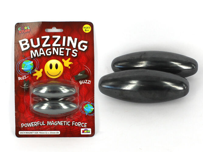 The "Cool Stuff" Buzzing Magnets (often sold in sets of 2) are high-powered, polished hematite magnets with an distinctive ellipsoidal or oval shape. They are designed to create a loud buzzing or chirping sound when tossed into the air, as the two magnets attempt to come together.
