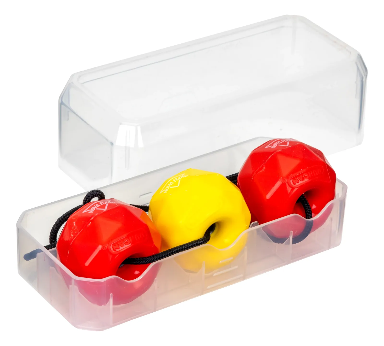 The Duncan Nova Flow Attached Juggling Skill Toy is a, often found in vibrant, high-visibility colors such as red and yellow, designed for flow arts and manipulative play. It merges elements of traditional juggling, poi, and yo-yo, featuring a unique configuration of three weighted balls (two tethered at the ends and one that slides along the string) to allow for a wide range of movements.