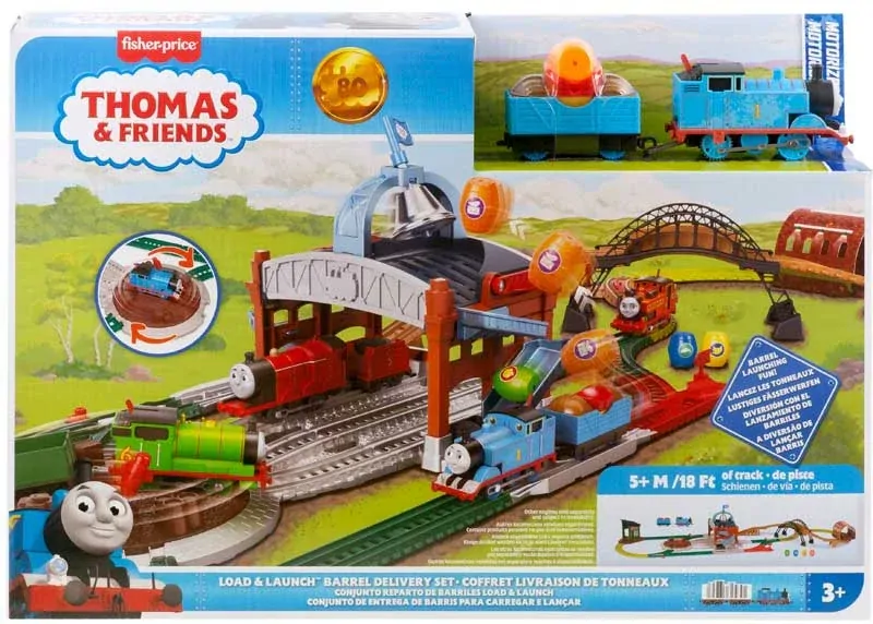 With this 80th anniversary-inspired Thomas & Friends Load & Launch Barrel Delivery Set, pre-schoolers can have barrels of fun just like their favourite engine and his pals! This expansive set includes a Classic Thomas motorized engine and cargo car, plus 18 feet of track and accessories to build out the world of Sodor. Flip the switch on the top of the engine to send Thomas through the tunnel and over the bridge to the delivery warehouse, where kids can load up one of four included barrels. Release Thomas to send him to the train depot, where the barrel automatically launches onto the depot's roof, ringing the bell. The turntable resets Thomas for his return to the depot, load another barrel and run again!