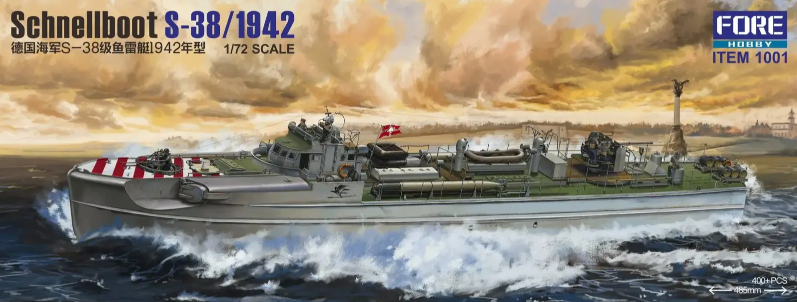 This 1/72 scale model by FORE is of the German Navy Schnellboat S-38, a high-speed German combat boat used during World War II. Included within this kit you'll find decals, clear parts, etching parts, metal barrel, metal wire, and transparent film.