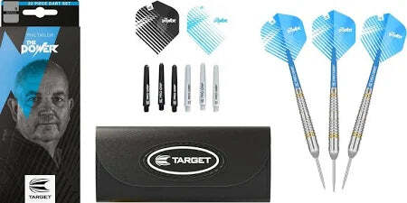 The Phil Taylor dart by Target Darts is an all-in-one range featuring both a complete dart set and a combination of useful accessories for your darts set up. The set features a dart barrel designed with radial grooves and flecks of gold throughout. The Phil Taylor Kit comes with a range of accessories to ensure you have the optimum set up to play darts. The kit is completed with 3 sets of Pro Grip shafts, 3 sets of Taylor Flights and 1 storage wallet.