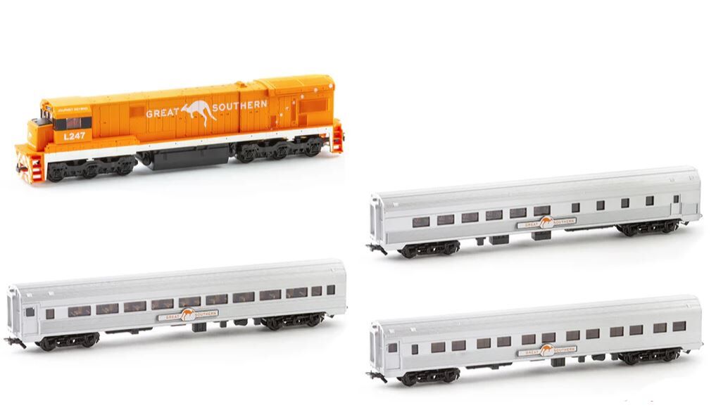 The Frateschi Great Southern train pack brings Australia’s newest luxury long‑distance service to your HO scale layout. This set includes a finely detailed L Class diesel‑electric locomotive in Great Southern silver livery, paired with three matching Budd‑style passenger cars, creating a complete and visually striking consist straight out of the box.