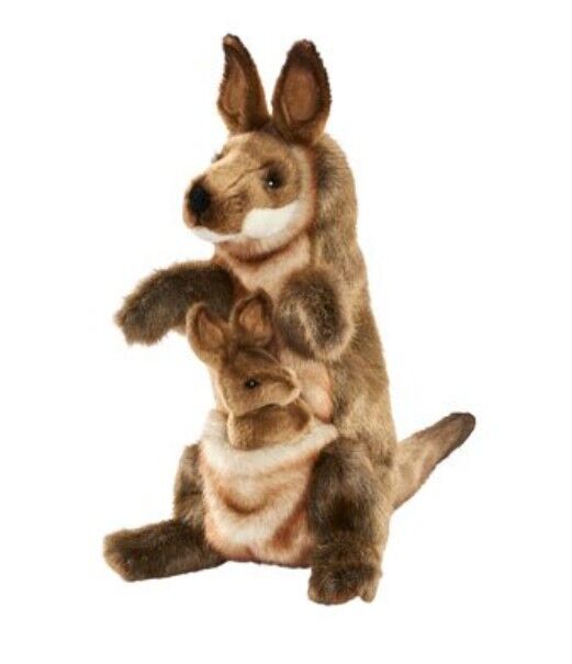 Hansa is renowned the world over for it's true to life recreations of the worlds most loved animals. This simply stunning Kangaroo and her adorable joey are from the Australian Native collection and are ready to bounce right into your little ones arms and light up their heart. Covered in super soft faux fur our adorable Kangaroo and Joey are ready for cuddles. Their golden fluffy fur has been hand trimmed to highlight their sparkling eyes. Brought to life with meticulous attention to detail our adorable Kangaroo and Joey Full Body Puppet is perfect for developing motor skills, hand-eye coordination, communication skills, self-confidence, and social-emotional connections.