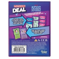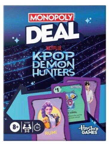 This Monopoly Deal: KPop Demon Hunters game combines the fast action of the Monopoly Deal game with characters and themes from the hit Netflix film. Use action cards to go viral, take on the spicy challenge, deploy Bobby to watch out for trouble, and more! Players add fan cards to their personal Fan Club to pay other players who go after them. The first player to have 3 different complete item sets wins! This exciting family card game for kids and adults can be played in about 15 minutes, so it’s an ideal game for fitting in quick fun anytime.