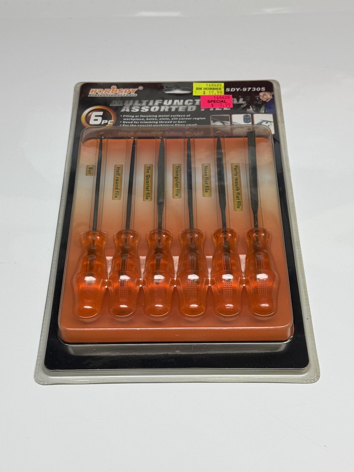 6 piece file set. Includes bur, half round file, quartet file, triangular file, nose flat file, party mouth flat file.