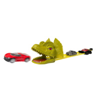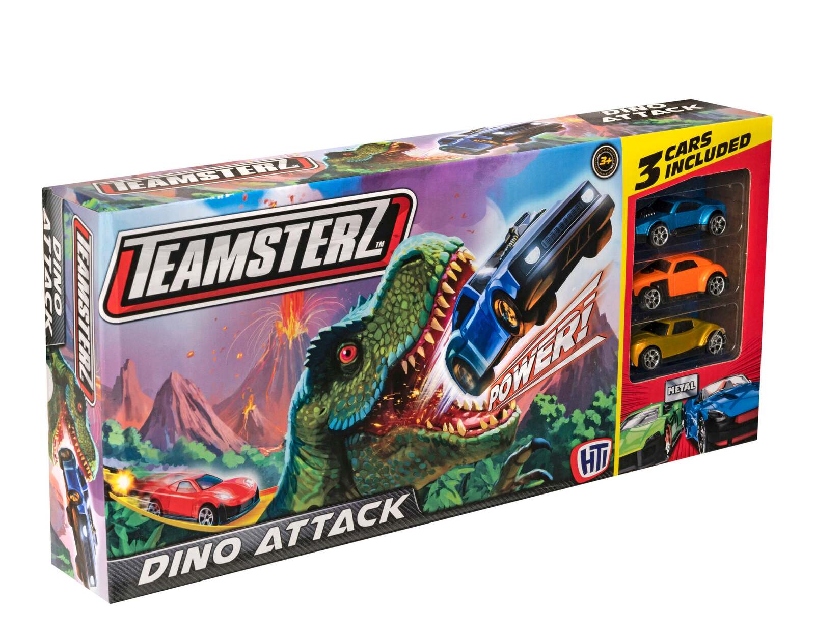 Escape the dinosaurs ROAR! Launch your car and race down the track to jump through the sharp-toothed jaws of the dinosaur! The Teamsterz Dino Attack Track Set features a pull-back elastic launcher and single lane race track with dino head jump! This great value track set is easy to construct and comes with 3 x die-cast cars for immediate play! The perfect gift for any enthusiastic little racer, offering hours of imaginative fun! The track set is compatible with other Teamsterz playsets and die-cast vehicles for broader play. The Teamsterz die-cast vehicles included are approximately 3 inch scale and feature a high quality die-cast body shell and independent free moving wheels.