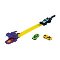 Escape the dragons ROAR with the Teamsterz Dragon Blast with 3 cars! Launch your car and race down the track to jump through the fire breathing jaws of the dragon! This Track Set features a pull-back elastic launcher, single lane race track with dragon head jump and 3 x die-cast cars for immediate play! The perfect gift for any enthusiastic little racer, offering hours of imaginative fun! Suitable for ages 3 years +