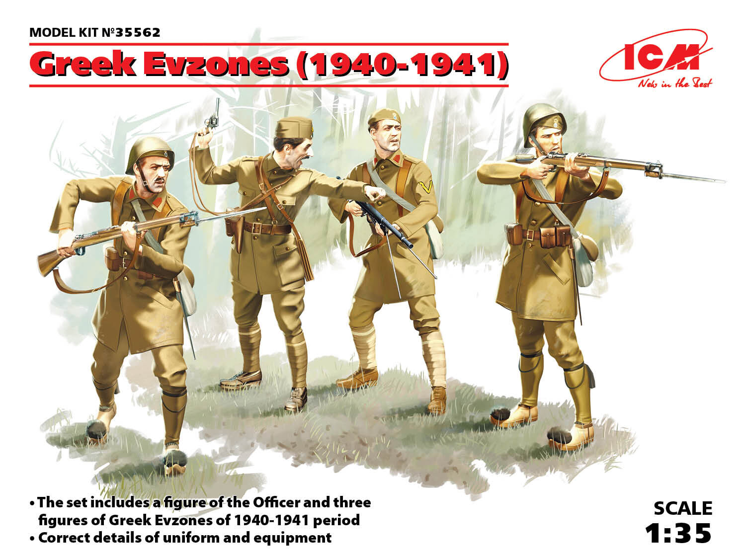 The set includes 63 parts for assembly of a figure of the Officer and three figures of Greek Evzones of 1940-1941 period.