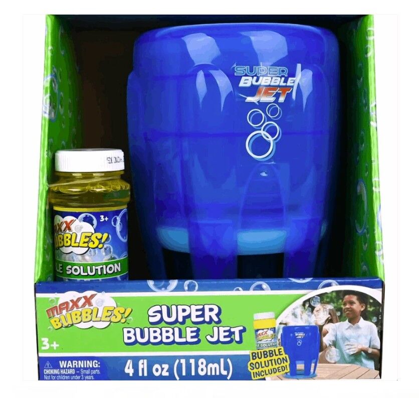 Maxx Bubbles Super Bubble Jet. With an innovative design, this automatic machine blows tons of big bubbles. It's easy to use! Simply pour in the bubble solution, flip the on/off switch and watch the extreme bubble action. The continuous bubbles will blow high into the air and create a bubble wonderland in seconds. Toddlers will love to chase the bubbles and race to pop them. Parents will love the active, outdoor play. Perfect for birthday parties, family events, playtime at the park and everyday backyard fun! Includes 4oz bottle of bubble blast solution to get started.