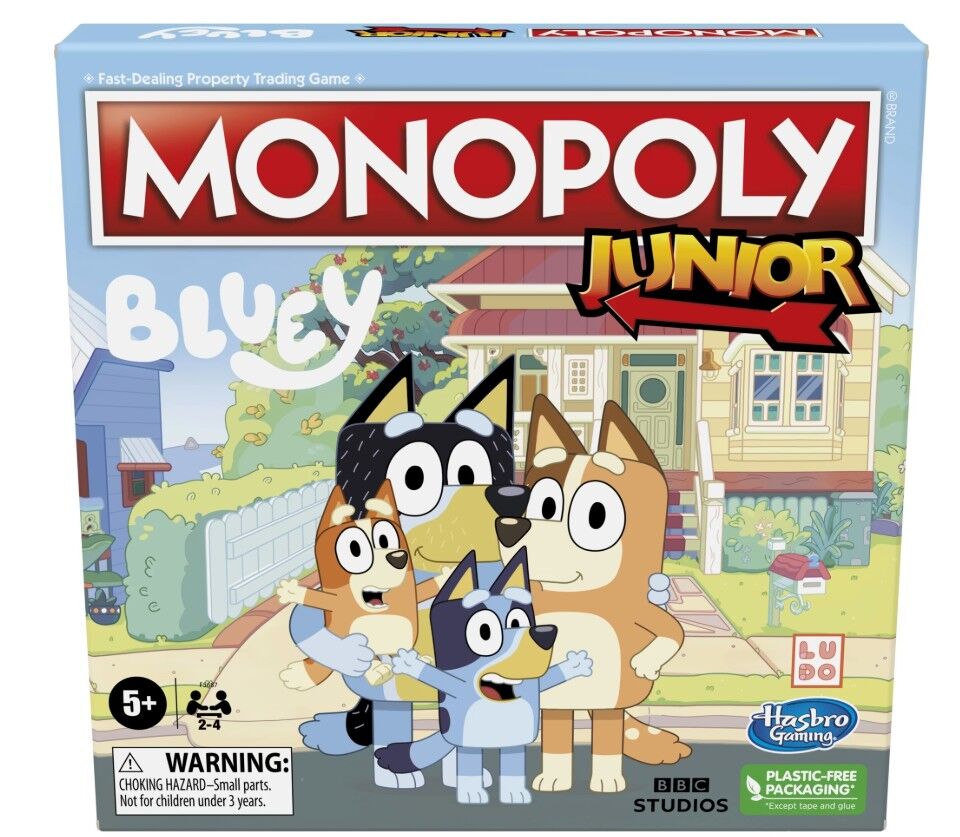 Collect the most properties while taking an imaginary adventure all over town with Bluey, Mum, Dad and Bingo. In the Monopoly Junior: Bluey Edition game, players move their character token around the board buying and selling properties such as Bingo's Kindy, Hammer barn, Big Peanut and Bluey's School. It's so much fun for kids to place a marker on their very own property and collect dollar bucks. The board game is for 2-4 players and makes a fun gift for kids aged five and up.