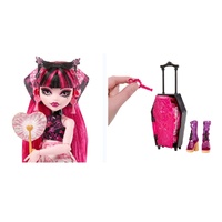 • Inside the luggage case lurks a vampire and 19 surprises. Step one: Use the key hidden in the front of the case to open the door and reveal Draculaura doll in a fangtastic resort outfit!