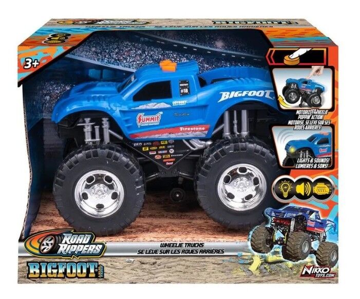 BIGFOOT ® Wheelie Trucks Assortment The Road Rippers - Bigfoot Wheelie Trucks Assortment features vibrant and robust 10-inch trucks designed for thrilling wheelie action and high-octane adventures. Each truck showcases unique designs and colors, perfect for kids who love dynamic play. Engineered for durability, these trucks can conquer various terrains and perform impressive stunts. The Bigfoot trucks not only provide hours of entertainment but also ignite children's imaginations as they embark on epic journeys. Get ready to race, flip, and zoom with these exciting wheelie trucks!