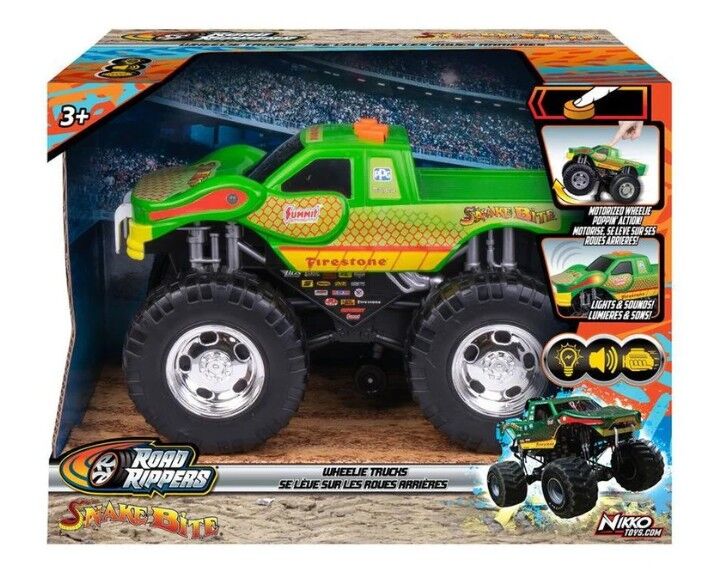 BIGFOOT ® Wheelie Trucks Assortment The Road Rippers - Bigfoot Wheelie Trucks Assortment features vibrant and robust 10-inch trucks designed for thrilling wheelie action and high-octane adventures. Each truck showcases unique designs and colors, perfect for kids who love dynamic play. Engineered for durability, these trucks can conquer various terrains and perform impressive stunts. The Bigfoot trucks not only provide hours of entertainment but also ignite children's imaginations as they embark on epic journeys. Get ready to race, flip, and zoom with these exciting wheelie trucks!