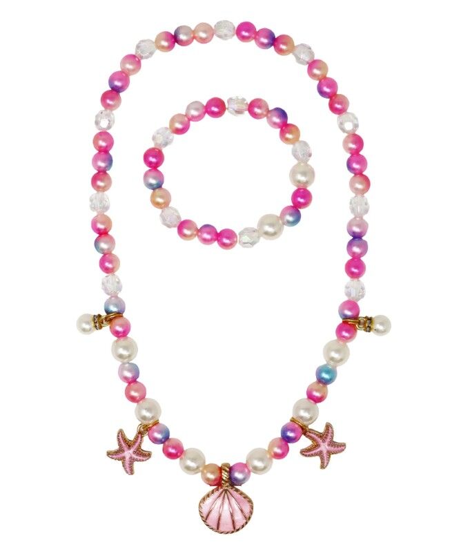 Make waves with the Mermaid Fantasy Necklace & Bracelet Set by Pink Poppy — a dreamy jewellery set designed for children who love ocean magic, sparkle and all things mermaid. This beautiful Necklace & Bracelet Set features ombre pearl beads in soft mermaid tones, mixed with iridescent faceted beads and statement pearl accents for a luminous, under-the-sea glow. The finishing touch? Gold-tone metal charms adorning the necklace with hand-painted enamel details, including a clam shell, starfish and sweet bow with pearl to add a magical, fairytale feel. The matching bracelet makes this set extra special for gifting. Whether it’s for dress-ups, parties or everyday magic, this Fairytale-inspired Jewellery Set is a keepsake-style piece kids love to wear.