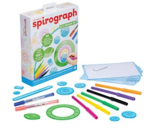 Made from 100% recycled plastics!The original Spirograph design set is now available in an Eco Set but still lets you use it the classic way to create countless amazing designs!The 30 piece set features precision parts, pens and reusable Spiro-Putty! Spiro-Putty holds the fixed position Spirograph pieces securely in place on the paper for precision detailing!