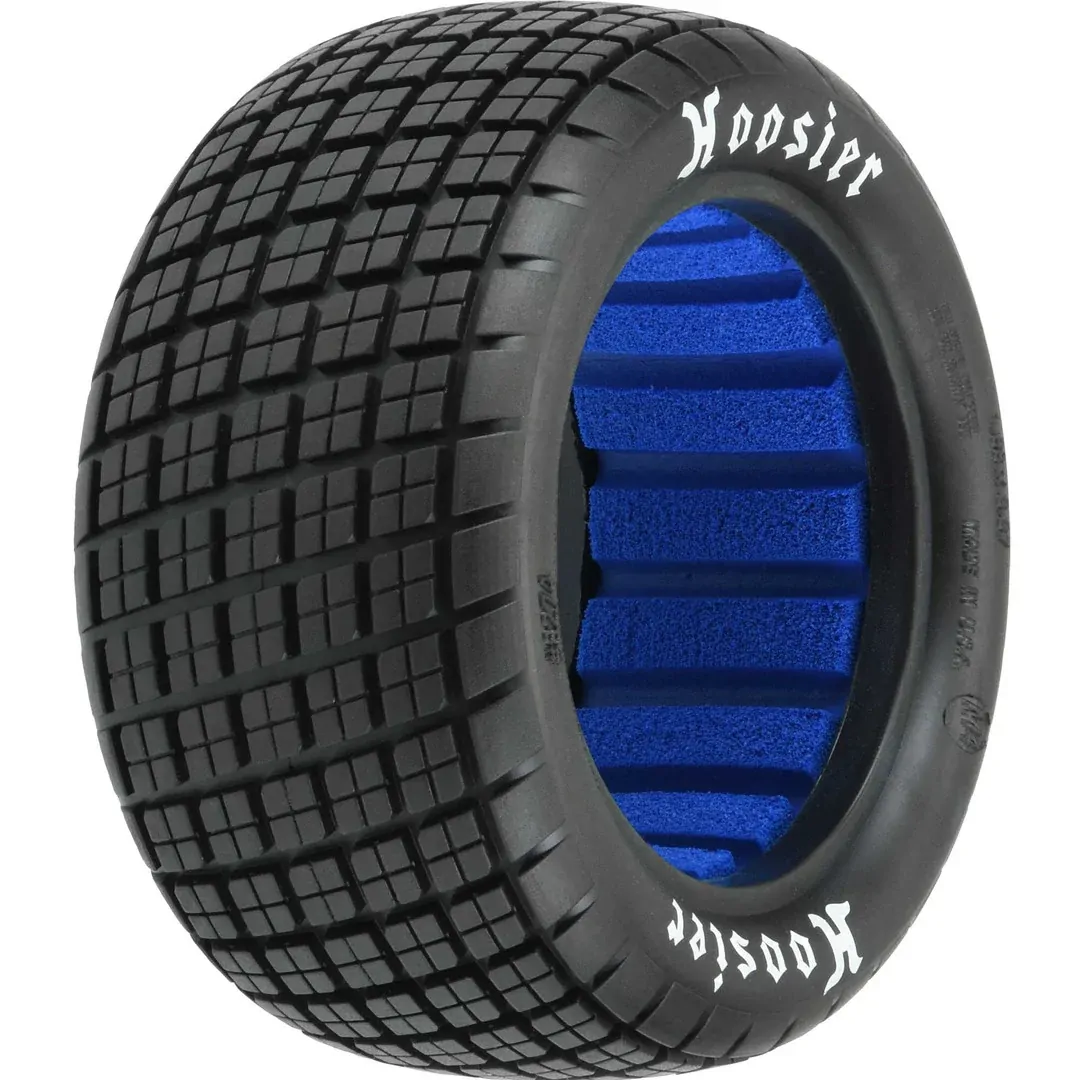 This is a pair of Hoosier Angel Block 2.2" Rear Buggy Tires with closed cell foam. Fully licensed by Hoosier, these Hoosier Angel Block 2.2" Rear Buggy Tires were specifically made for Dirt Oval racing! The Hoosier Angel Block tread pattern not only looks amazingly Scale but the tire also offers the same High-Performance as full-size tires, so you can have realistic style and performance on your Sprint Cars or any 2.2" Buggy Tire application. And just like the full-size Hoosier tires, these Angle Block tires proudly display White Hoosier Logos on the sidewall! To make it easy on race technical inspection during spec races, Pro-Line has molded in Compound Identifiers into the Sidewall of each tire. The Hoosier Angel Block 2.2" Rear Buggy Tire features rounded side tread for consistent slide action that will not catch ruts and flip your truck when you throw it up into the corner. The Hoosier tread pattern creates great forward grip combined with long-lasting and consistent performance. The Hoosier Angel Block 2.2" Rear Buggy Tires and every other tire that Pro-Line makes is proudly Made in the USA! Throw down the inside pass on your racing buddies with Pro-Line's Hoosier Angel Block 2.2" Rear Buggy Dirt Oval Sprint Car tire!