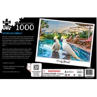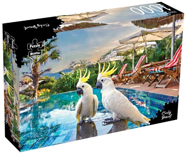 This 1000-piece puzzle captures two curious cockatoos lounging poolside at a luxurious resort, their vibrant yellow crests and striking white feathers glowing against the sparkling blue water. The scene blends Australia's iconic birdlife with a dreamy holiday setting, creating a whimsical fusion of wildlife and relaxation.