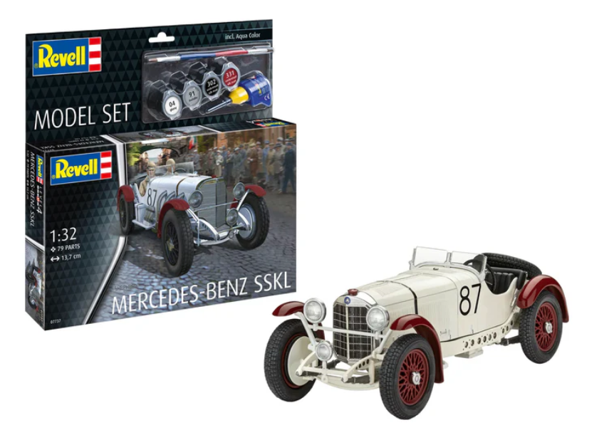 The Mercedes-Benz SSKL (= super sports-short-brief) was the last model of the very successful S-series. Its 7.1-liter engine delivered 300 hp output. With the racing car, Rudolf Caracciola was the first non-Italian to win the legendary "Mille Miglia". - Multi -part body - true to the original spoke rims - Authentic decay pictures In addition to basic colors, glue and brush are also included.