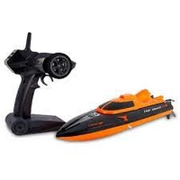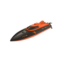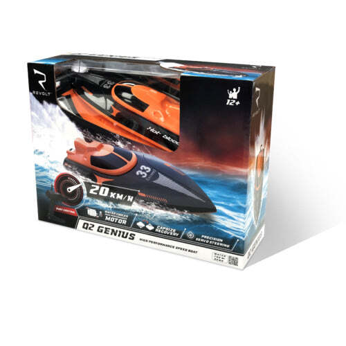 Make waves at 20 KMH with this 1:36 scale racing boat (36cm / 14.2" long). Fully manoeuvrable with servo rudder for precise control. Water sensor to auto start boat when placed in the water. Features water cooled motor, waterproof, anti tilt hull and capsize recovery mode. Pistol type remote with low power warning. Not intended for use in salt water. Includes Boat Rack Unit, Spare Propeller & Charging Cable. Ages: 12+