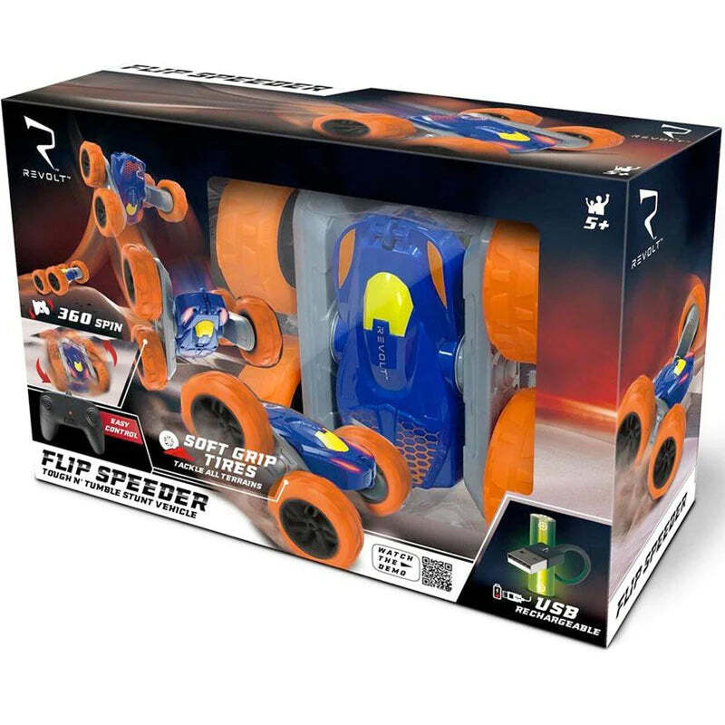 Revolt Radio Control Flip Speeder Toy Vehicle features powerful 4WD capabilities that make it possible for 360-degree stunts in all terrain.