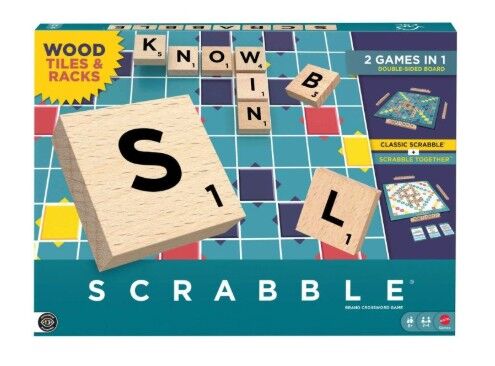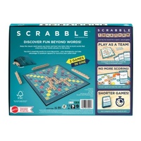 Enjoy two exciting ways to play the beloved word game with the Mattel Games Scrabble Board Game. Flip the double-sided board to choose between the classic competitive Scrabble experience or the collaborative, fast-paced Scrabble Together mode designed for casual, team-based fun. Scrabble Together mode challenges teams to complete Goal Cards like "Play a five-letter word" or "Play on a corner square". With the simple scoring system where you earn a point for each Goal Card completed, try to win together by completing 20 Goal Cards as a team.