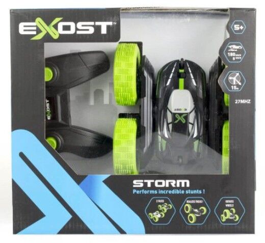 Chew up the roughest terrain with the amazing Exost Storm! This super speedy vehicle travels up to 8km/h, with a unique double-sided body for acrobatic 360° flips, massive all-terrain tyres built to climb any obstacle, independent swivel axles, and an easy to use remote control that works from up to 15m away!