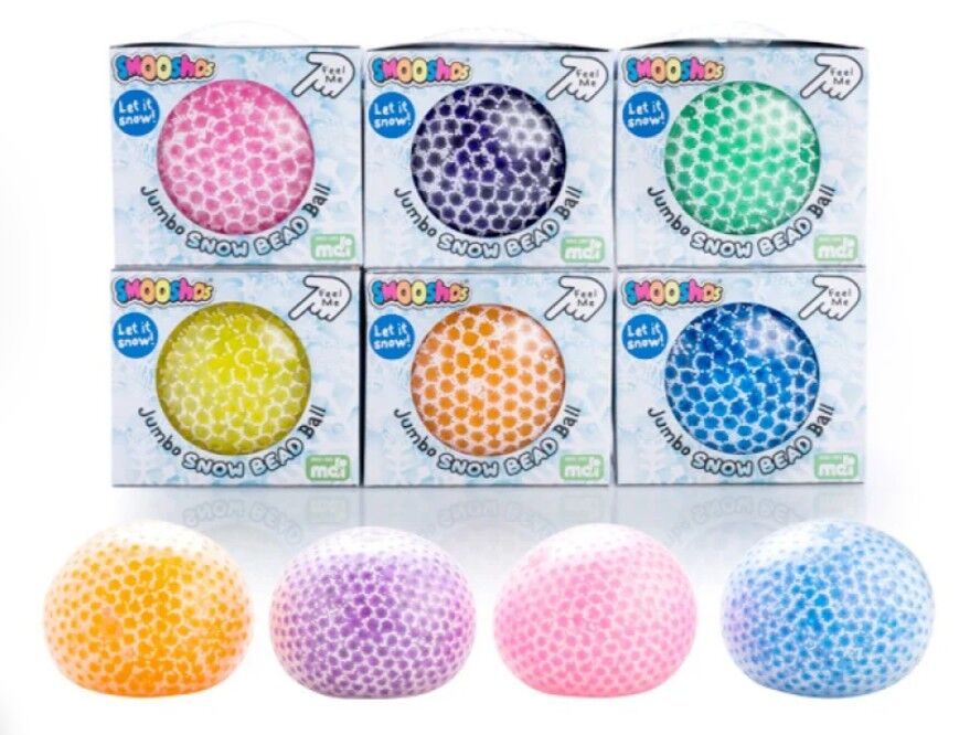 Squishy Smoosho ball that fits perfectly in the palm of your hand, filled with gel beads and white snowy microbeads for dual-layered texture, amazing bouncy feel that makes your worries melt away!