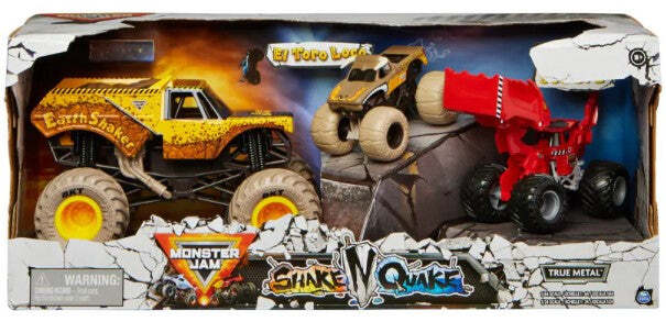 Expand your Monster Jam collection with the official Monster Jam Shake N’ Quake 3-Pack! This themed set includes 3 exclusive die-cast monster trucks that you can’t find anywhere else: El Toro Loco and Dirt Squad Scoopz in 1:64 scale, and Earth Shaker in 1:24 scale! Featuring stylish Shake N’ Quake exclusive deco, detailing and more graphics than ever before! Plus, with official BKT tires and an authentic chassis, the Shake N’ Quake Monster Jam trucks are ready for epic Monster Jam action! The Shake N’ Quake 3-Pack is the ultimate gift for Monster Jam fans. Create your own Monster Jam events right at home with the Shake N’ Quake 3-Pack! SHAKE N’ QUAKE 3-PACK: Dominate everything in your way with this Monster Jam set of 3 exclusive Shake N’ Quake die-cast monster trucks! 3 EXCLUSIVE MONSTER JAM TRUCKS: Shake N’ Quake with El Toro Loco (1:64 scale), Earth Shaker (1:24 scale) and Dirt Squad Scoopz (1:64 scale) – a must-have for Monster Jam fans! AUTHENTIC REPLICAS: The Shake N’ Quake monster trucks in this set all feature official BKT tires, awesome detailing and life-like graphics, bringing the Monster Jam action right to you! OFFICIAL MONSTER JAM TOYS: The official Monster Jam 1:64 scale monster trucks and are the ultimate toys for kids and gifts for 3 year old boys and girls! TOYS FOR 3 YEAR OLD BOYS AND GIRLS: Monster Jam monster trucks for boys and girls are for ages 3 and up. Monster Jam toys, playsets, toy cars and RC trucks are at the top of kids’ toys & games wish lists!