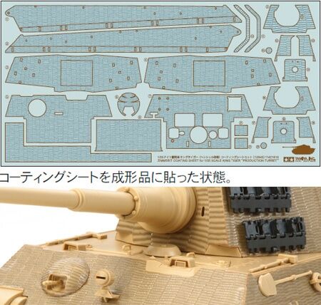 This sticker sheet enables reproduction of the anti magnetic mine Zimmerit coating used on German tanks in the latter stages of the Second World War. The sheet can be simply cut out and attached to the 1/35 King Tiger model with Production Turret to provide an effective three-dimensional finish that can be painted on.