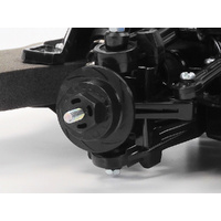 The shaft-driven 4WD TT-02 chassis employs a longitudinal layout with the battery on the left and the motor on the right, to give excellent stability. In addition, it features identical left and right suspension arms and uprights for ease of assembly, plus easy-to-maintain gearboxes. It is a highly adaptable chassis, as it offers 2 different wheelbases, 2 ground clearance settings and 2 tread set-ups in addition to a range of 10 possible gear ratios. It is not short on looks either, with brake disc-shaped wheel hubs and stylish front bumper supports. Black mesh design wheels use semi-pneumatic slick tires.