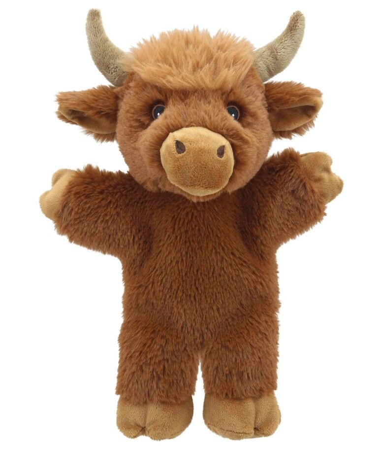 With its fluffy coat, soft muzzle, and iconic horns, this Highland Cow puppet brings the charm of the countryside to playtime. Ideal for imaginative adventures, this puppet fits most adult hands and is perfect for children, offering fun for all ages. Made from recycled materials as part of our continued commitment to sustainability, this Highland Cow is incredibly soft, boasting a high-quality finish. This eco collection perfectly complements our other puppets and soft toys with fantastic attention to detail. Part of our fantastic collection of ECO Walking Puppets, with many styles to collect from favourite farm, pet, and wildlife animals. Every single thing in each puppet, from the thread used to embroider the eyes to the stuffing making it extra cuddly, has been recycled and re-used - Pretty impressive, huh? Join us in our commitment to the environment as you embark on eco-friendly adventures with these charming Walking puppets: ‘Have a puppet - have fun - help save the planet’ Suitable from birth, recommended from 12 months and above. Average Size: 32 x 22 x 12 cm