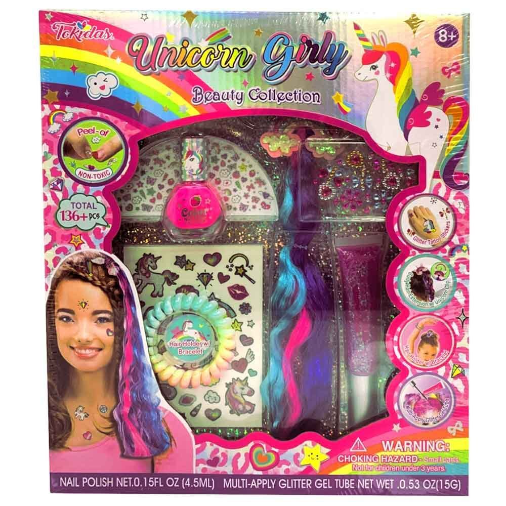 Includes: 1 bottle of scented nail polish, 1 sheet of glitter tattoos stickers, 1 curly hair extension with rainbow clip, 1 sheet of patterned gems, 1 multi-apply glitter gel and 1 hair holder with bracelet.
