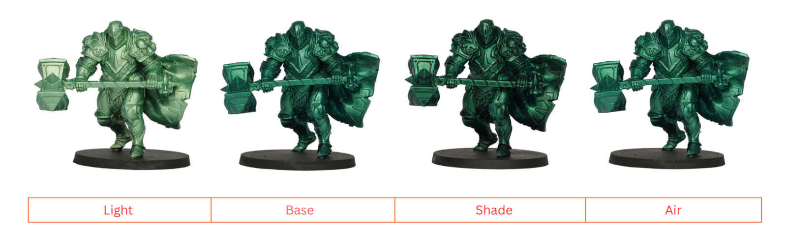 The picture below shows the visual difference between the colours in the TMM Dusken Green Color Set.