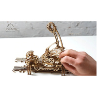 Number of parts: 354 Assembly time: 8-10 hours Level: Intermediate Model size: 40*50*21 сm Developing its new fascinating series, Mechanical Town, Ugears presents another addition to the collection: the Rail Manipulator. Set up in the dock of Mechanical Town not far from the Robot Factory, the Manipulator is a purely utilitarian model, which by no means makes it less entertaining than the other models in the range. Like the rest of the Ugears models, the Manipulator is designed to make sure the fun goes on after the assembly is completed. With a number of extras that come in the box, the model guarantees hours of an exciting new pastime. Speaking of extras, with the Manipulator itself, you also receive two sections of rails, the shed under construction, two shipping crates with doors, crane, freight carriage, and five characters. Design & engineering The Manipulator is a mechanical claw with three levers that sits on a platform on the rails. The rails can be connected in parallel or in one line. The settings are completed with a pseudo-metal shed under construction made of giant trusses which arrived straight out of the Industrial age with one of the characters, a roofer with a hammer, sitting on a beam of the shed. The Worker holding signal flags assists the Manipulator operator to control the process, while the Worker with a shovel and the Worker with a wrench are minding their own business in the docks. The model also includes one of the docks’ most important pieces of equipment, the Crane. It can be disassembled and put back together almost by a wave of the hand. With the supplementary mechanisms the rotation and angle of the crane can be locked even with a load. And an important addition to the setting is the Freight carriage with drop sides. Load and unload your freight crates along with the disassembled crane easily and move them to a new destination. All the parts of the set are made of a high-quality plywood and needs no extra materials or tools to assemble. How does it work? The claw itself sits on a platform that can rotate manually or by a valve. The operator’s cab, equipped with a protection lid and adjustable headlight, is found in the front part of the model. The counter-clockwise rotation of the cabin switches the Manipulator’s modes: initial position (driving mode) – the claw’s rotation platform locked, the model moves along the track; 90 degree turn (free mode) – the rotation platform is unlocked; 180 degree turn (loading mode) – the wheels of the models are locked along with the gear in the front axle that connects to the ledge on the rails. The rear of the model carries the lever that controls lifting, lowering, and holding of four foot supports providing extra-steadiness while operating the claw. With its articulated claw, the Ugears Manipulator can load and move the freight crates in the Carriage with an extraordinary – up to 1 cm – preciseness. Based on the original prototypes, the Manipulator will teach you about the operational and constructional peculiarities of the real-life machines, such as cranes, excavators, robotic arms, etc; their mechanics and functionality. All in all, the Manipulator has a great capacity both as an assembly model that is exciting to put together and as a great play time companion due to its diverse functionality. Not to forget about its educational value provided by the great mechanics based on the real-life designs. And if you feel like you need to get even more fun from the model, you can always hook your Manipulator up with the other Ugears models from your collection with the coupling hitch holes. Assemble without glue like all UGEARS models.