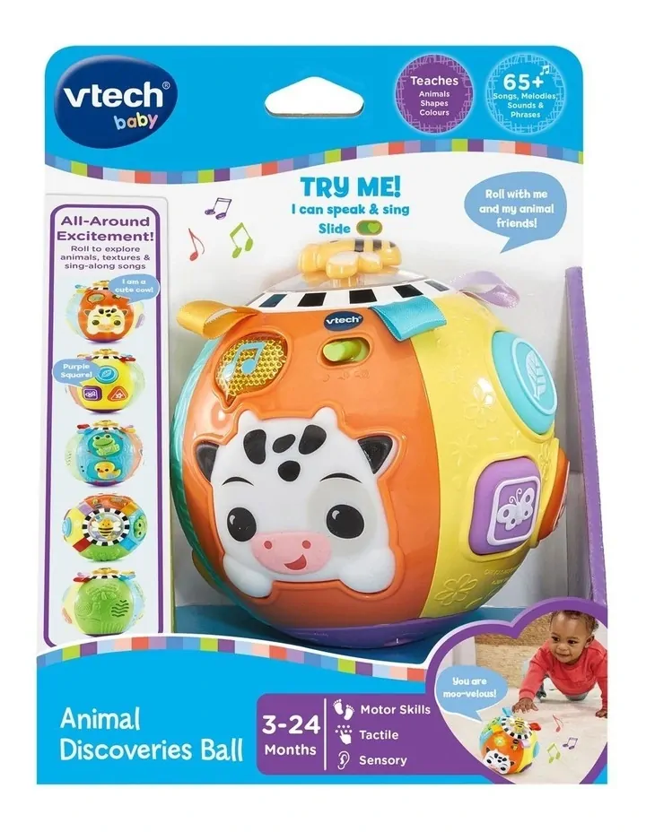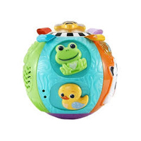 Baby can explore it all with the Animal Discoveries Ball. This five sided ball features electronic and non-electronic play. Activate learning phrases by pressing the Cow and discovering lights and sounds with the music button. Soft shape buttons voice out shape names and colors when pressed. Slide and twist the Duck and Frog to enhance gross motor skills, spinning the bee and shaking the beads help develop hhandeyecoordination and activate auditory stimulation. 4 Fourolourful tags can be manipulated for sensory exploration. Feel outlines of a leaf, tree, and snail with textured patterns to activate tactile stimulation.