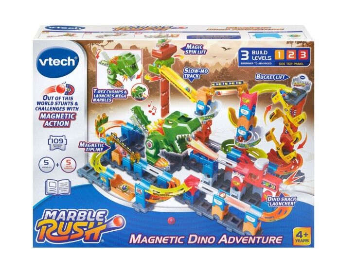 Electronic dino lights up and plays music and sound effects! Play set includes 100 pieces and 10 marbles (5 normal + 5 Mega which trigger magnetic features). Launch marbles and watch as dino chomps down on the Mega Marbles and extends its tail! Motorised spinning lift carries marbles up to the top of the set for continuous play! Watch as the spiral lift rapidly carries Mega Marbles up! 2 magnetic zip lines zoom Mega Marbles across gaps! Easy-to-construct, continuous, modular marble runs make it faster for children to innovate and build! Compatible with other Marble Rush sets! Discover more on marblerush.com