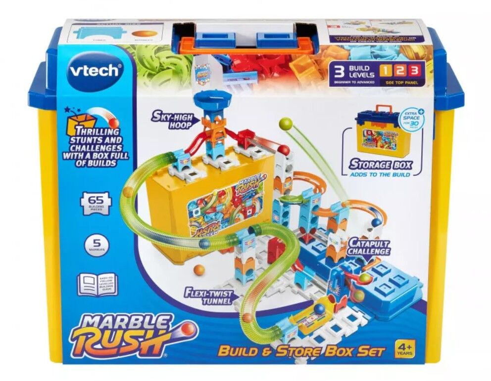 Keep the fun rolling with the VTech Marble Rush Build & Store Box Set! This exciting playset includes everything you need to build your own thrilling marble run. Watch as the colorful marbles zip and zoom through the twists and turns you create. And when you're done playing, simply pack everything up in the convenient storage box for easy cleanup. Hours of endless entertainment await with this engaging toy!