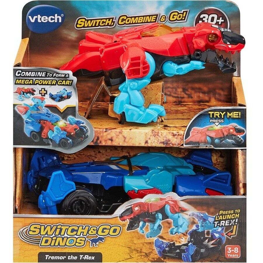 Can you feel the tremors!? It's Tremor the T-Rex! This mighty 2-in-1 T-Rex plays wild sound effects, cool phrases and fun T-Rex facts with light effects at the press of a button! The included super car toy adds to the fun, and in a few simple steps can be switched and combined with Tremor to form a mega power car! Once combined, press the mega power car button to see Tremor leap out from within! Switch the open car shell back into a super car and speed away! Who'd be brave enough to face Tremor? Let's Switch & Go!