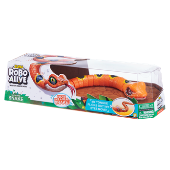 Live life on the wild side with ROBO ALIVE's Robotic Snake. Watch as it silently slithers, while flicking its tongue on the hunt for its next meal. Batteries not included. ON/OFF button on head. Eyeballs move. Tongue flicks in and out. Fast REAL-LIFE slithering