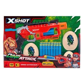 The new X-Shot Dino Attack range is here! Face the Dino invasion with your Dino Striker foam dart blaster. With its auto-rotating 6-dart barrel you will be able to blast incoming Dinos away with extreme accuracy. Can blast up to 90ft away. Join the Dino eggs together, place them down and then blast them away before they hatch! With the Dino Striker no invader stands a chance.